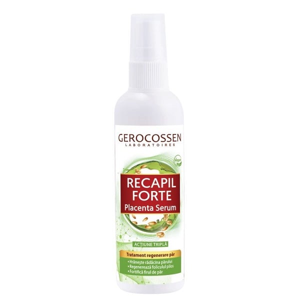 Recapil Forte este un ser cu acțiune intensă destinat regenerării părului, realizat pe bază de complex activ natural care aduce multiple beneficii pentru păr și scalp. Formula conține placenta vegetală de grâu, bogată în substanțe nutritive ce hrănesc rădăcina firului de păr și regenerează foliculul pilos, alături de provitamina B5 și extract de ghimbir.