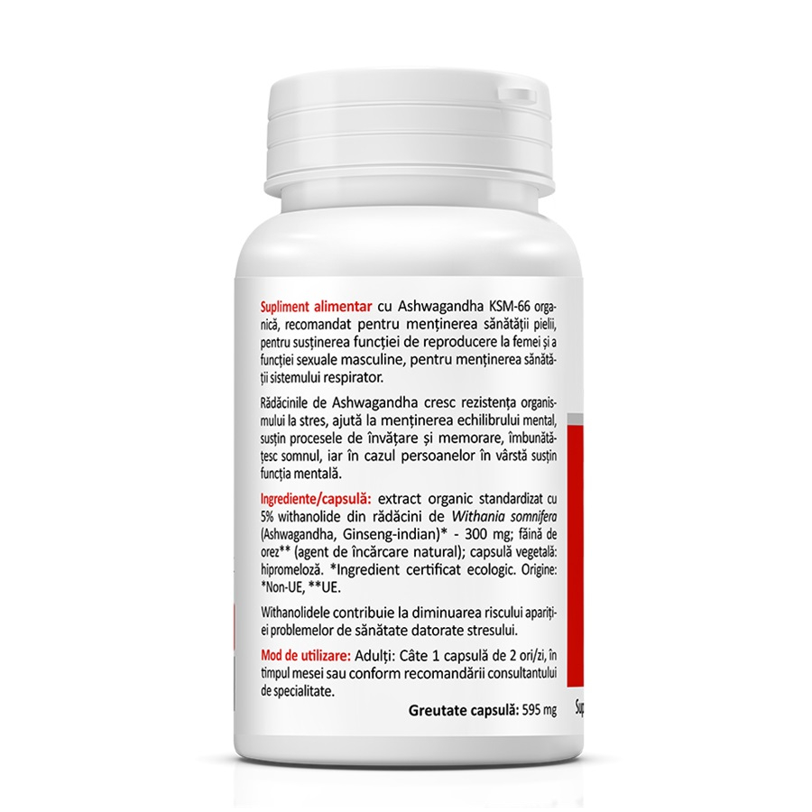 Extract organic standardizat cu 5% withanolide din radacini de Withania somnifera (Ashwagandha, Ginseng indian) – 300 mg per capsula.