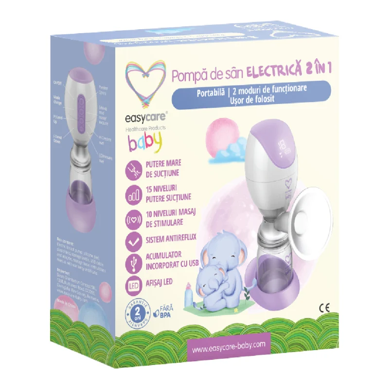 Pompa de san electrica EasyCare Baby este un dispozitiv eficient, simplu si util pentru extragerea laptelui matern in orice situatie. Aceasta are 2 functii principale: masaj de stimulare a lactatiei si mod suctiune. Modul masaj are 10 niveluri si modul suctiune are 15 niveluri de putere. Portabila, compacta si cu baterie reincarcabila cu durata lunga de functionare, pompa de san electrica EasyCare Baby este ideala pentru calatorii, dar si pentru utilizare la domiciliu, la maternitate sau chiar birou. Cu un design unic antireflux, laptele curge direct de la san in biberon. O pozitie de sedere comoda si o stare relaxata in timpul utilizarii pompei ajuta in mod natural la colectarea mai usoara a laptelui. Pompa de san electrica contine un afisaj digital de mari dimensiuni si butoane tactile ce permit o utilizare facila si intuitiva. Toate materialele utilizate sunt testate si certificate fara BPA, facand o utilizare sigura atat pentru mame cat si pentru bebelusi. Dimensiune cupei pentru san are marime universala de 24mm.