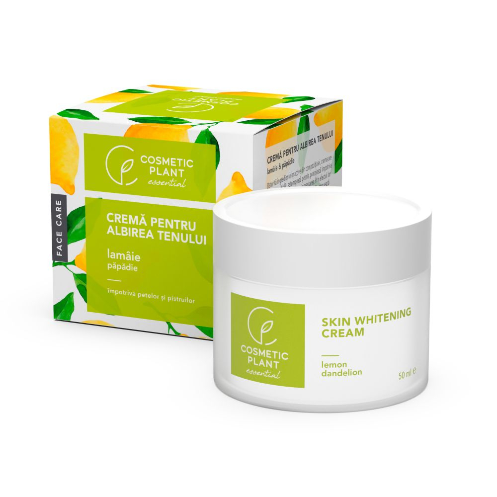Crema pentru albirea tenului Essential de la Cosmetic Plant are o acţiune multipla, contribuind la estomparea petelor pigmentare şi protejarea pielii împotriva radiaţiilor UV. Datorită ingredientelor sale active, crema reduce hiperpigmentarea şi atenuează petele deja formate prin efectul decolorant al extractelor de lămâie şi păpădie.