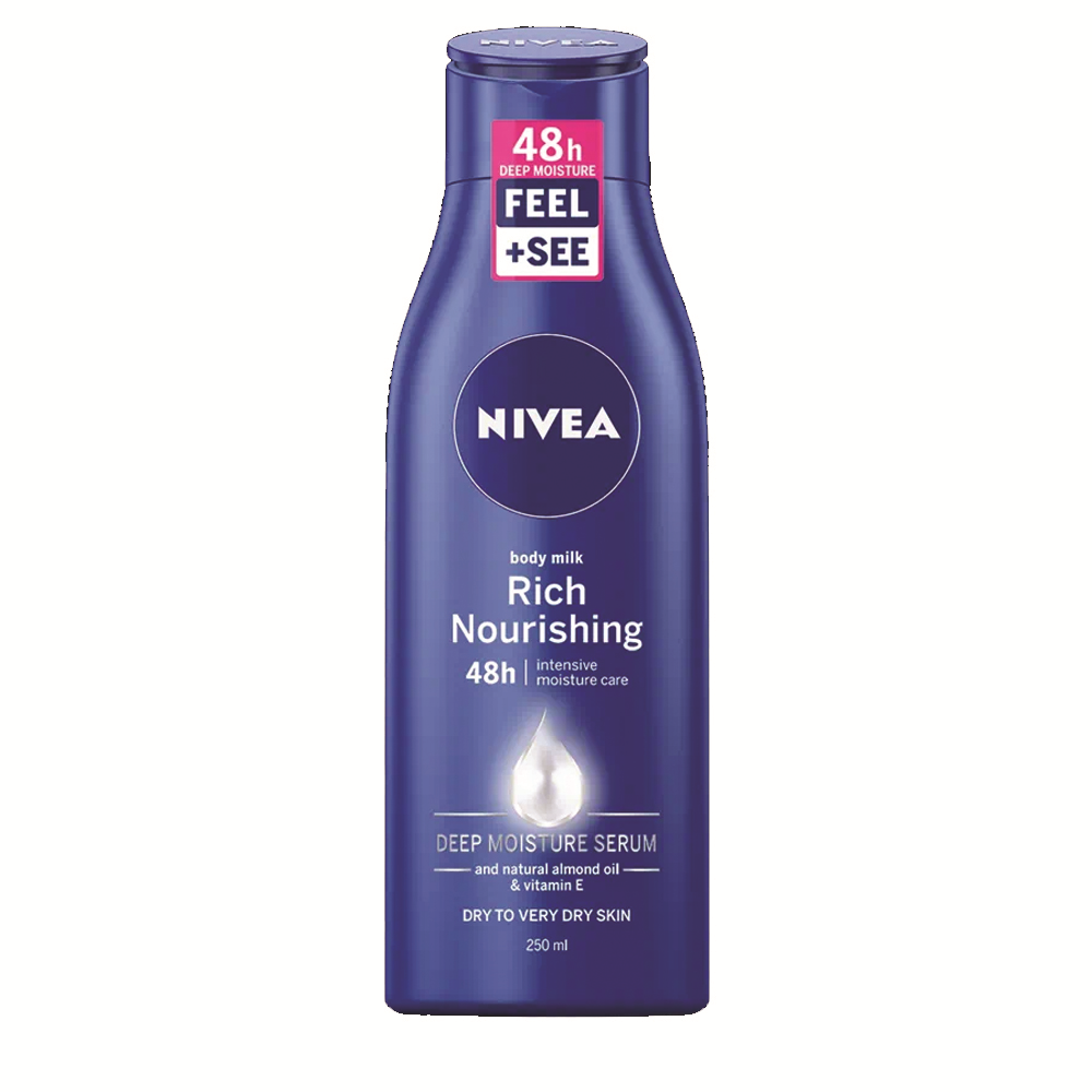 Lapte de corp pentru hidratare intensă, conceput special pentru pielea uscată și foarte uscată. Produsul conține o formulă cu serum Nivea și de două ori mai mult ulei de migdale, menită să păstreze nivelul optim de hidratare în straturile profunde ale pielii și să prevină deshidratarea acesteia.