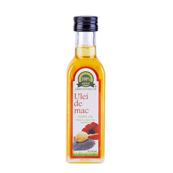 100% ulei pur de mac presat la rece din semințe de mac, netratate termic, foarte bogat în vitamina E, A, F, fosfolipide, calciu, magneziu, fier și cupru.